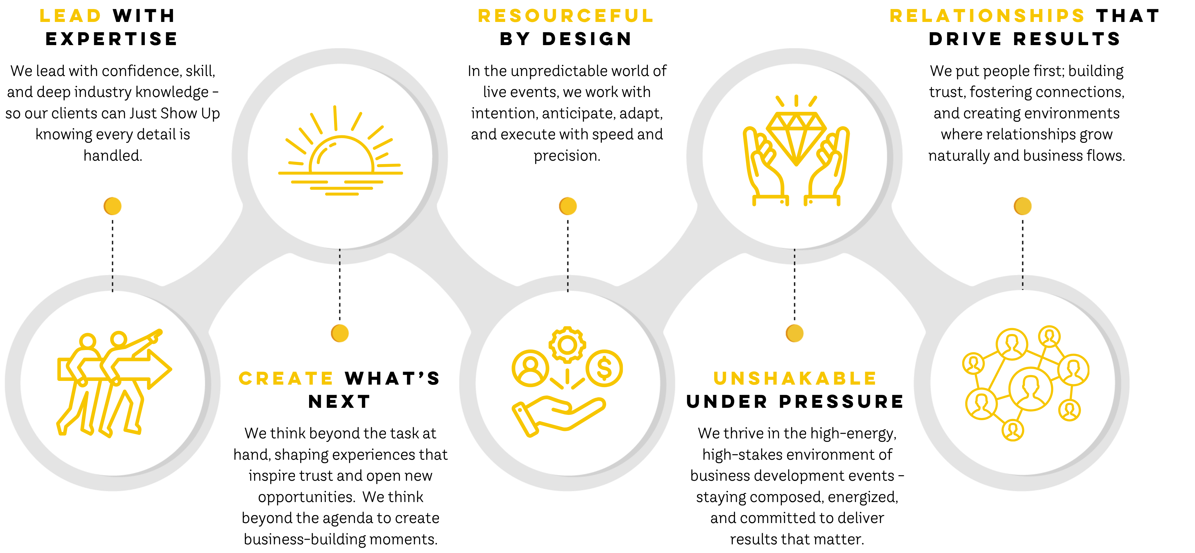 We lead with confidence, skill, and deep industry knowledge -so our clients can Just Show Up knowing every detail is handled.